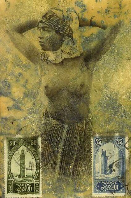 Based on postcards from Algeria, Tunisia and Morocco these rich and exotic collages represent Nick’s fascination with turn of the century North Africa. Layered with varnish, bees wax or transparent film it is often difficult to see exactly how these unusual pieces have been created. All measurements are in inches...